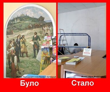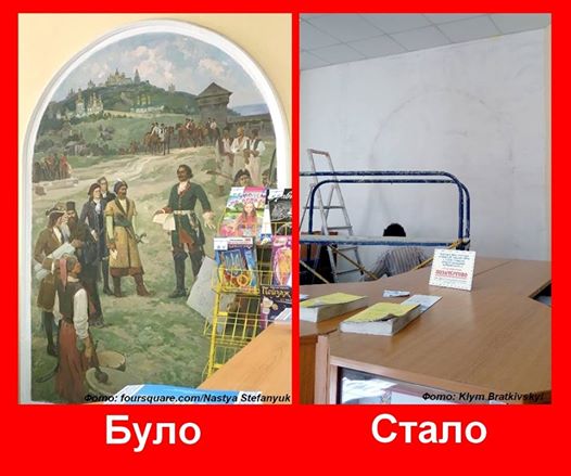 Братковский опубликовал снимки почтового отделения. На одном фреска еще находится на стене, на втором ее уже нет.