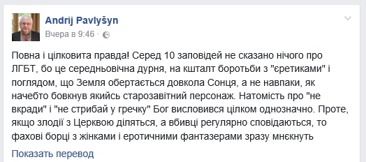 «Среди 10 заповедей не сказано ничего о ЛГБТ, потому что это средневековая дурня, вроде борьбы с "еретиками" и взглядом, что Земля вращается вокруг Солнца, а не наоборот, как будто ляпнул какой-то ветхозаветный персонаж.