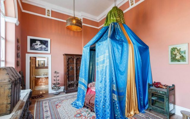 Как сообщается, в главной спальне есть двухэтажный потолок, два витражных окна, отдельный балкон и ванная комната с медной ванной и двойными раковинами, выполненными из окаменелой древесины.