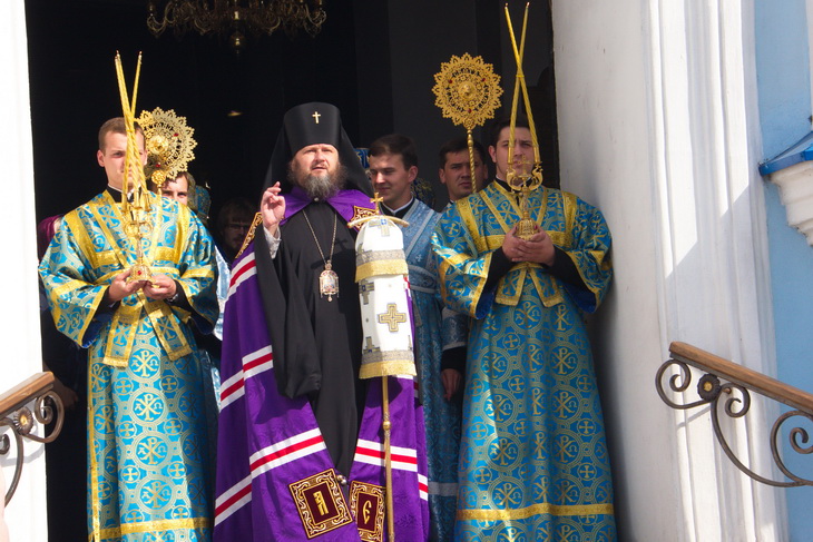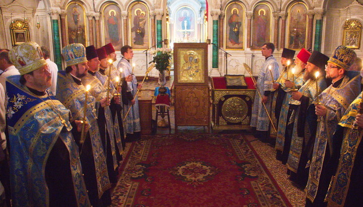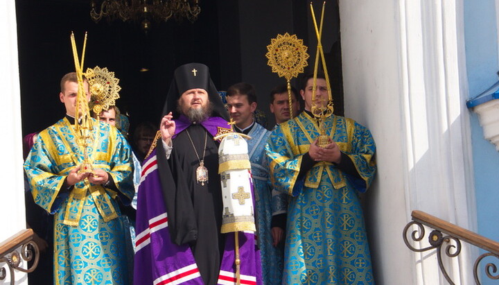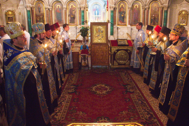 Высокопреосвященнейший Евлогий, архиепископ Сумский и Ахтырский, в сопровождении клириков кафедрального собора и других храмов Сум с пением богородичных песнопений встретили Святыню, которая была установлена на центральном аналое кафедрального собора.