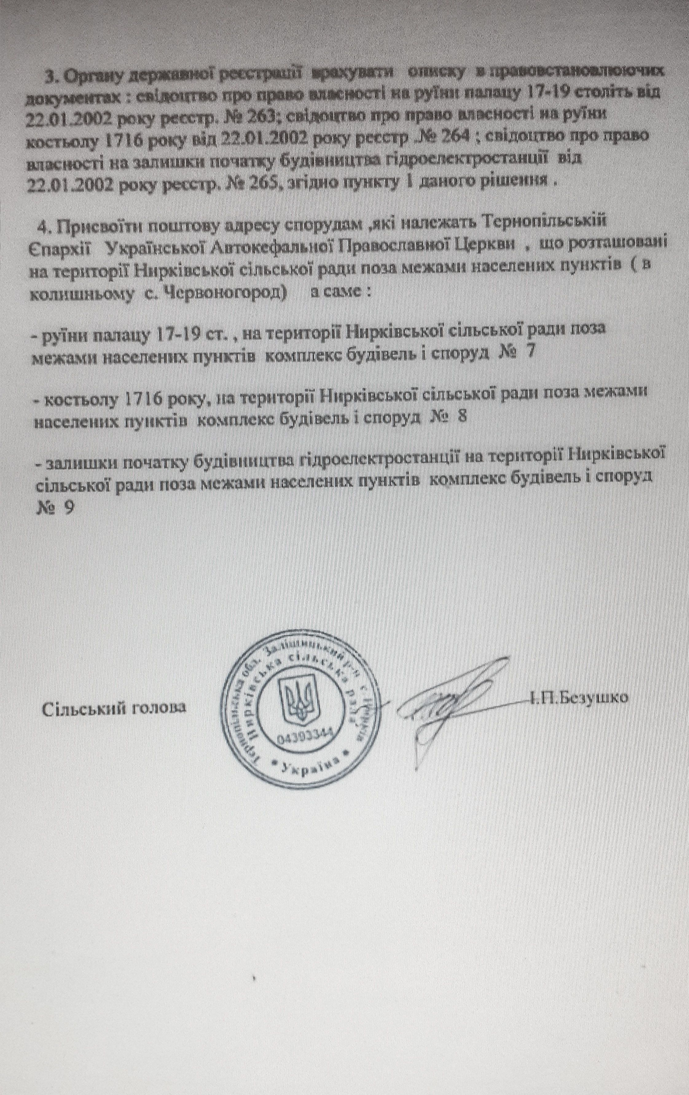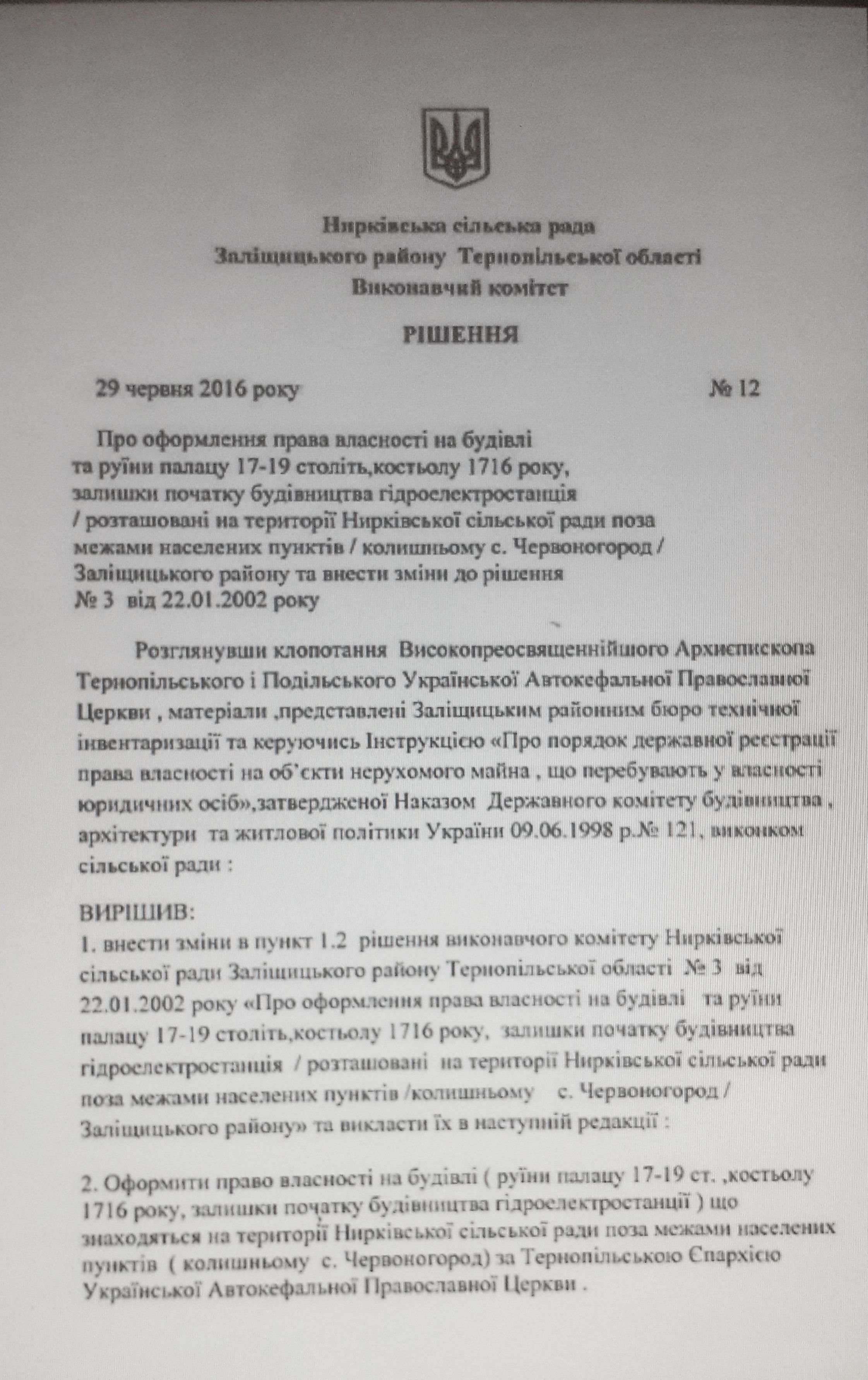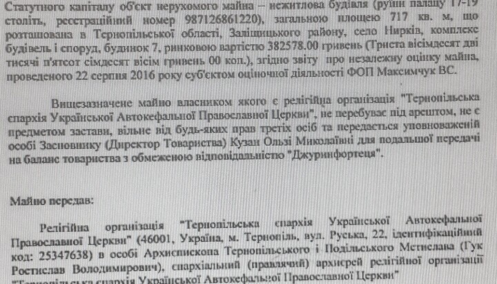 Журналисты приводят документы, согласно которым памятник архитектуры был передан предстоятелю УАПЦ Мефодию еще во времена президентства Леонида Кучмы для размещения там мужского монастыря святых апостолов Петра и Павла. Согласно свидетельству о праве собственности от 22 января 2002 года, руины Дворца принадлежали Тернопольско-Подольской епархии УАПЦ.