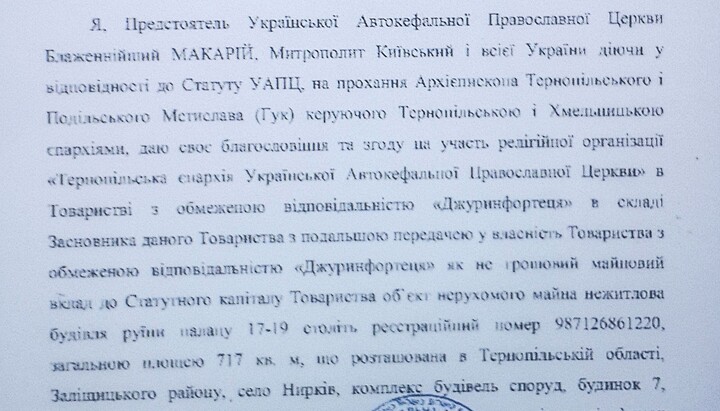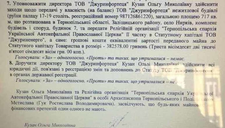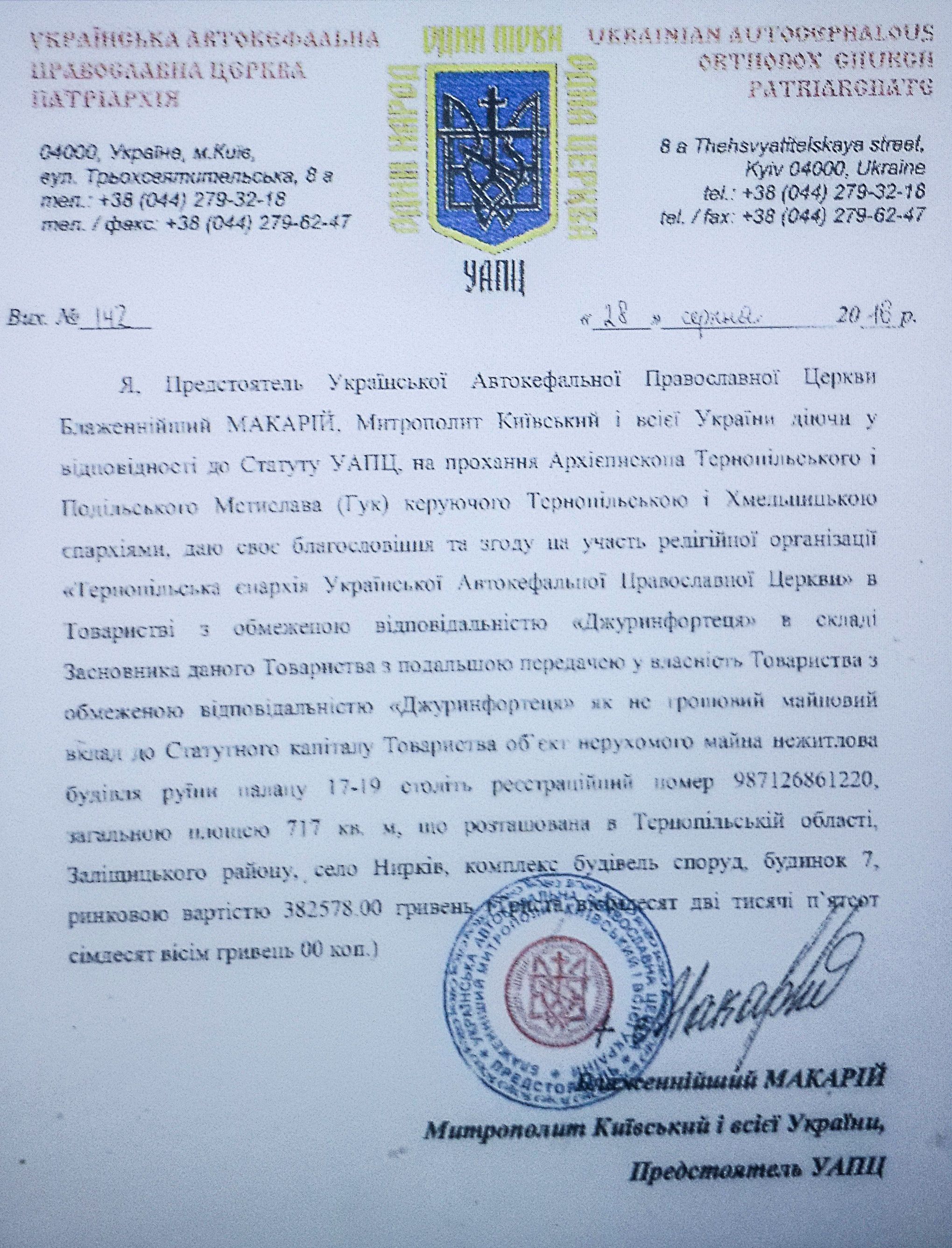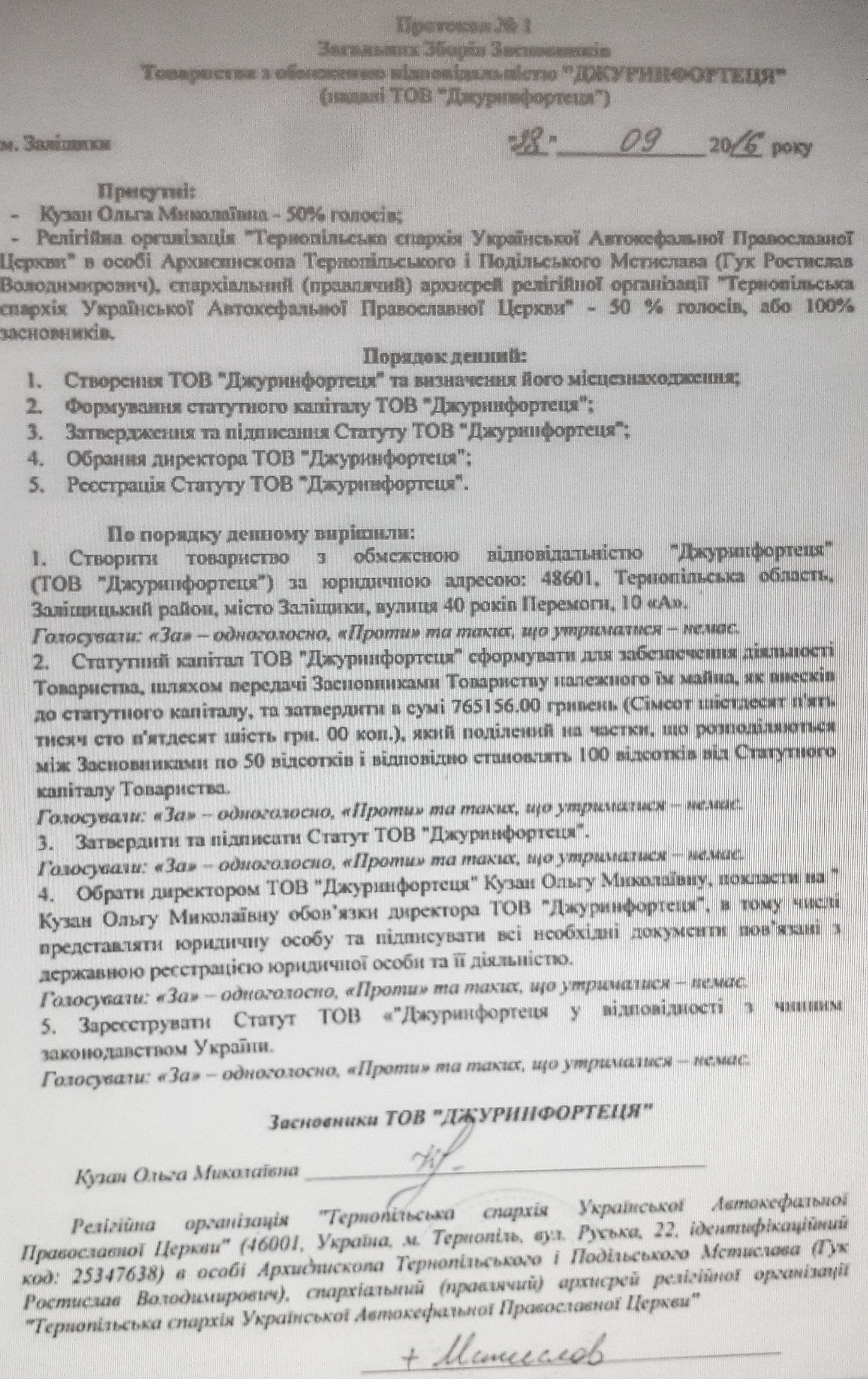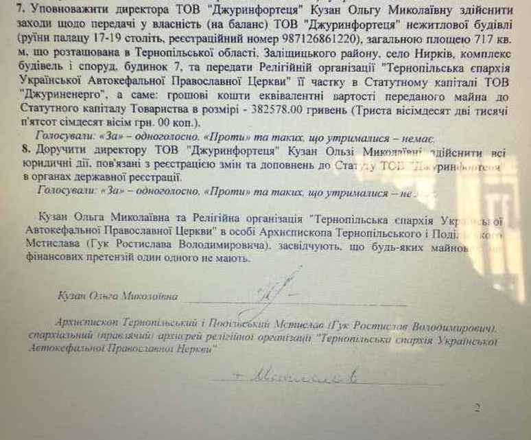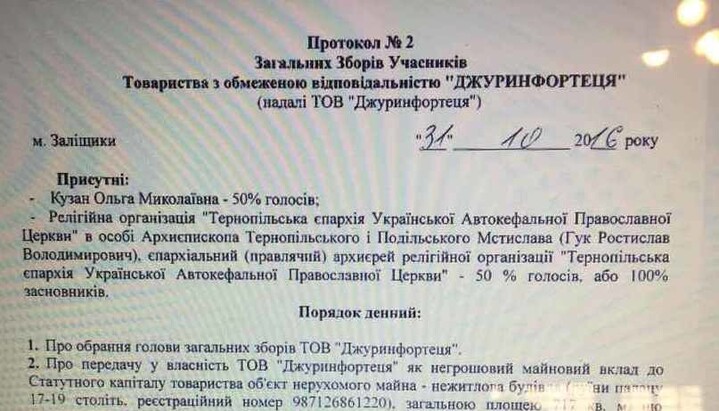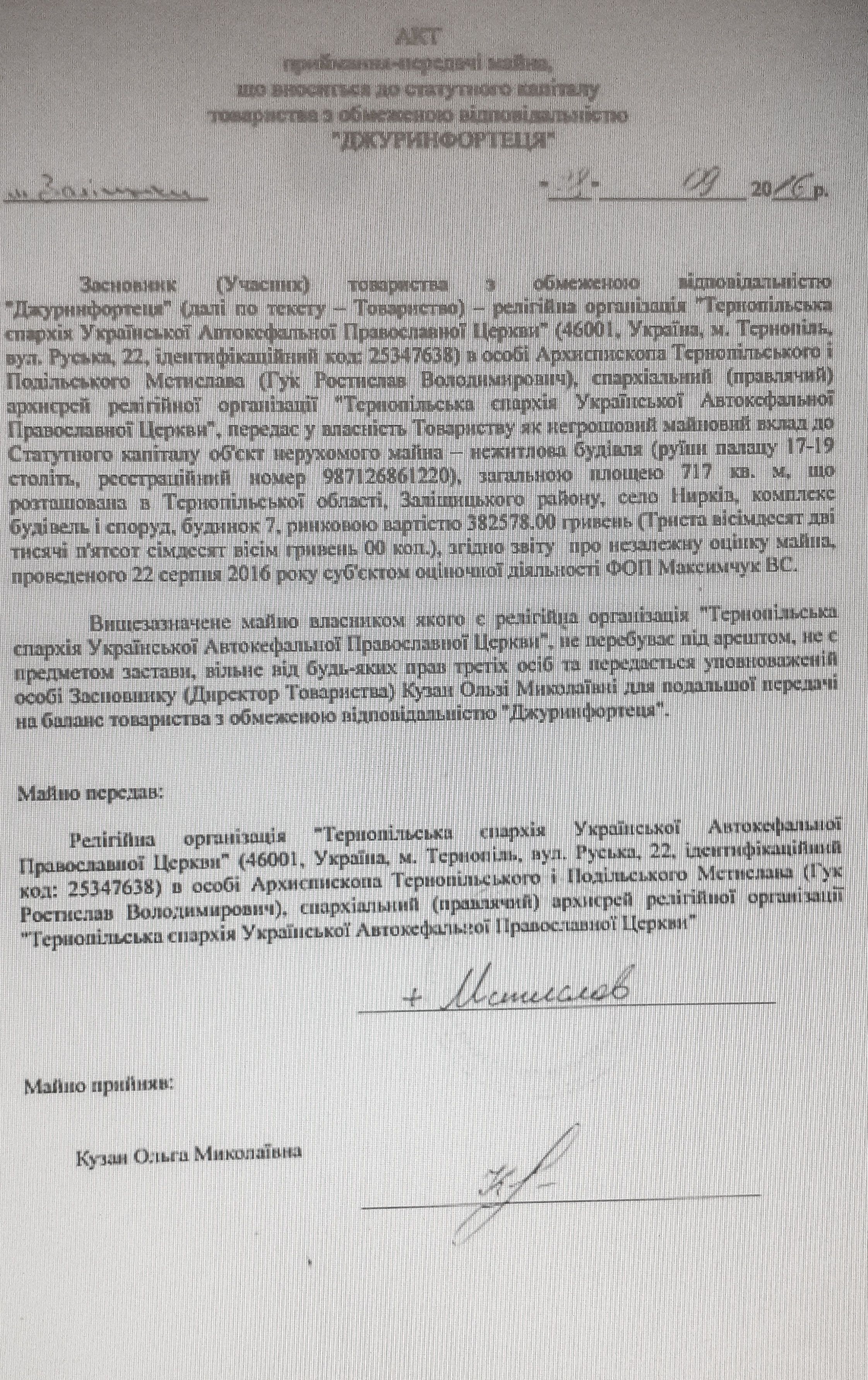 31 октября 2016 года архиепископ Мстислав (Гук) подписал документы о выходе Тернопольской епархии из состава ООО «Джуринфортеця» и передаче полномочий директору общества Ольге Кузан. При этом Тернопольская епархия забирала свой уставной капитал – 382 тысячи 578 грн.