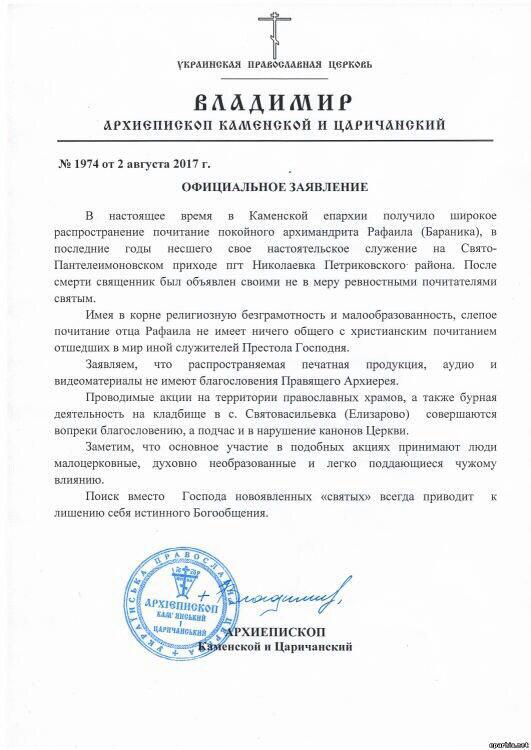Архиепископ Каменский и Царичанский Владимир выступил с заявлением по поводу нездорового ажиотажа вокруг покойного архимандрита Рафаила (Бараника). Владыка предостерегает верных УПЦ от опасности впасть в ересь.