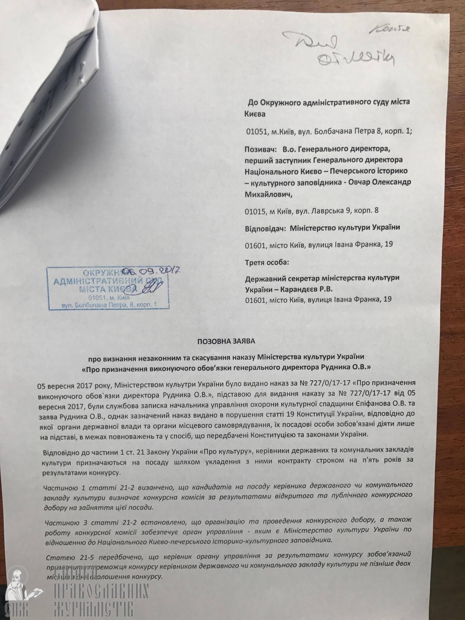 6 сентября в Окружной административный суд Киева подали исковое заявление относительно незаконного назначения Министерством культуры Украины исполняющего обязанности генерального директора Национального Киево-Печерского историко-культурного заповедника. Как сообщает корреспондент СПЖ, на данный момент у заповедника оказалось сразу два директора.