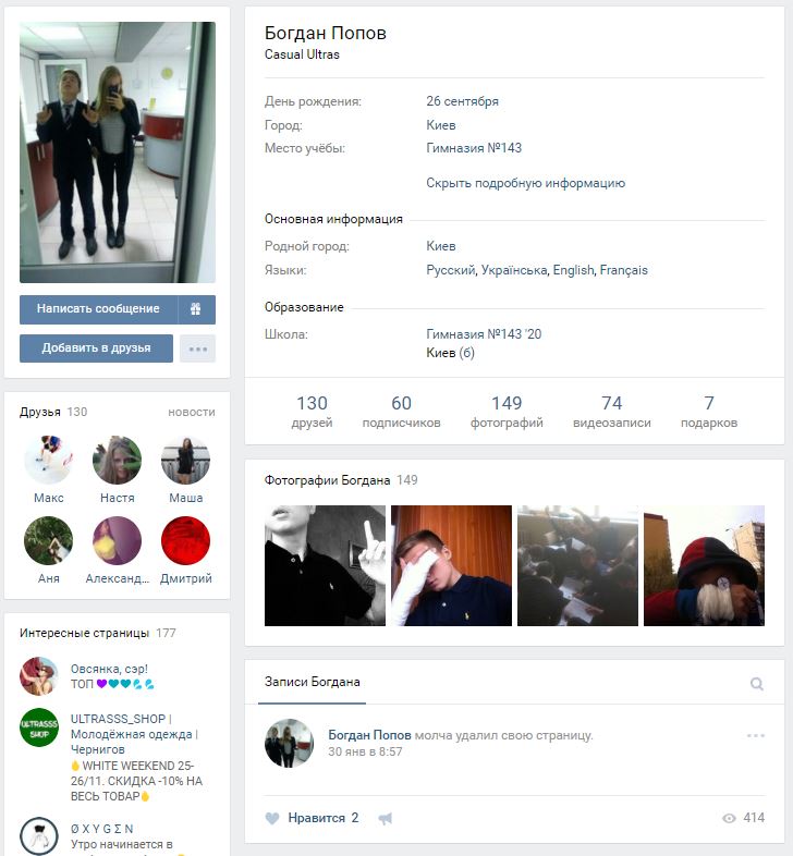 У Богдана на странице посты с этих сообществ, свои фото с призывами с подписями «на…уй. переселенцев». Правда, парень осторожничал – старался на всех снимках затирать лицо.