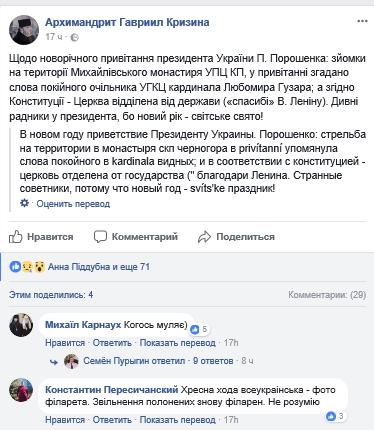 Архимандрит Гавриил Кризина так комментирует ролик на своей странице в Facebook: «По поводу новогоднего поздравления президента Украины П. Порошенко: съемки на территории Михайловского монастыря УПЦ КП, в поздравлении упомянуто слова покойного главы УГКЦ кардинала Любомира Гузара; а согласно Конституции - Церковь отделена от государства («спасибо» В. Ленину). Странные советники у президента, потому что новый год – светский праздник!»