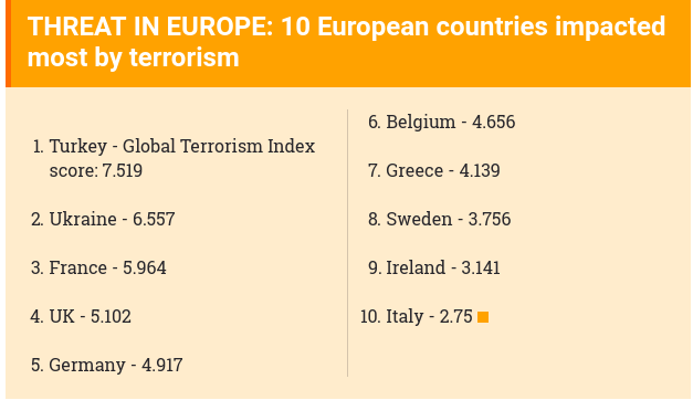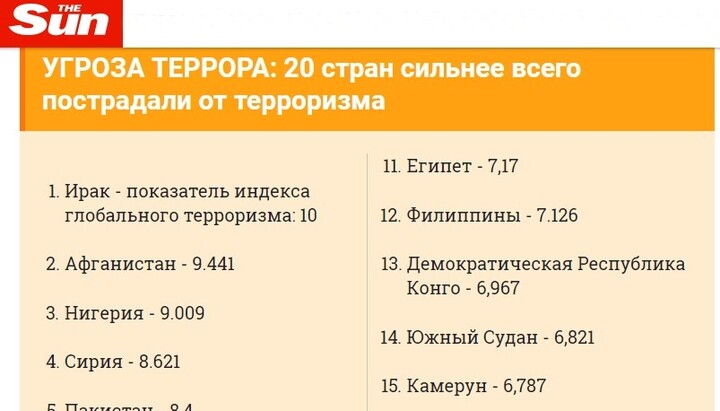 При этом Украина, по сообщению британской The Sun, занимает второе место среди стран Европы с высоким риском террористических атак во время праздников. Также сообщается, что Глобальный индекс терроризма 2017 года поставил популярные места отдыха, в том числе и Египет, среди 20 самых опасных стран: в этом списке Египет опережает Украину – 11 и 17 место соответственно.