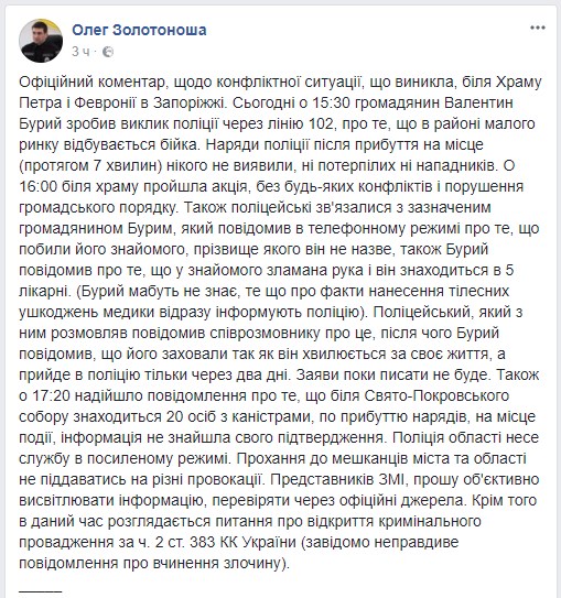 Полиция заведет дело о ложном избиении АТОшника в запорожском храме