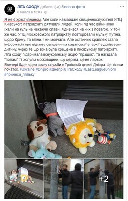 «Мы решили присоединиться к запорожскому флешмобу «Принеси игрушку в знак протеста Московскому патриархату». Пришли, принесли игрушки, расклеили листовки и устроили небольшой перформанс. Знаем, что по данному факту открыто уголовное производство, поэтому не знаем, пойдем ли дальше», – рассказал «Информатору» один из членов «Ліги Сходу».