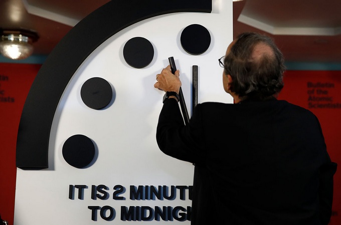 Теперь часы показывают 23:58, то есть до конца света осталось две минуты. Во время пресс-конференции в Вашингтоне специалисты заявили, что решение было принято в связи с «угрозой, порожденной злоупотреблением информационными технологиями». Вместе с тем ученые указывают, что «ситуация с ядерным оружием на планете близка к катастрофе», а проводимые Северной Кореей испытания несут угрозу всему человечеству. Однако специалисты уверены, что в будущем стрелка передвинется назад.