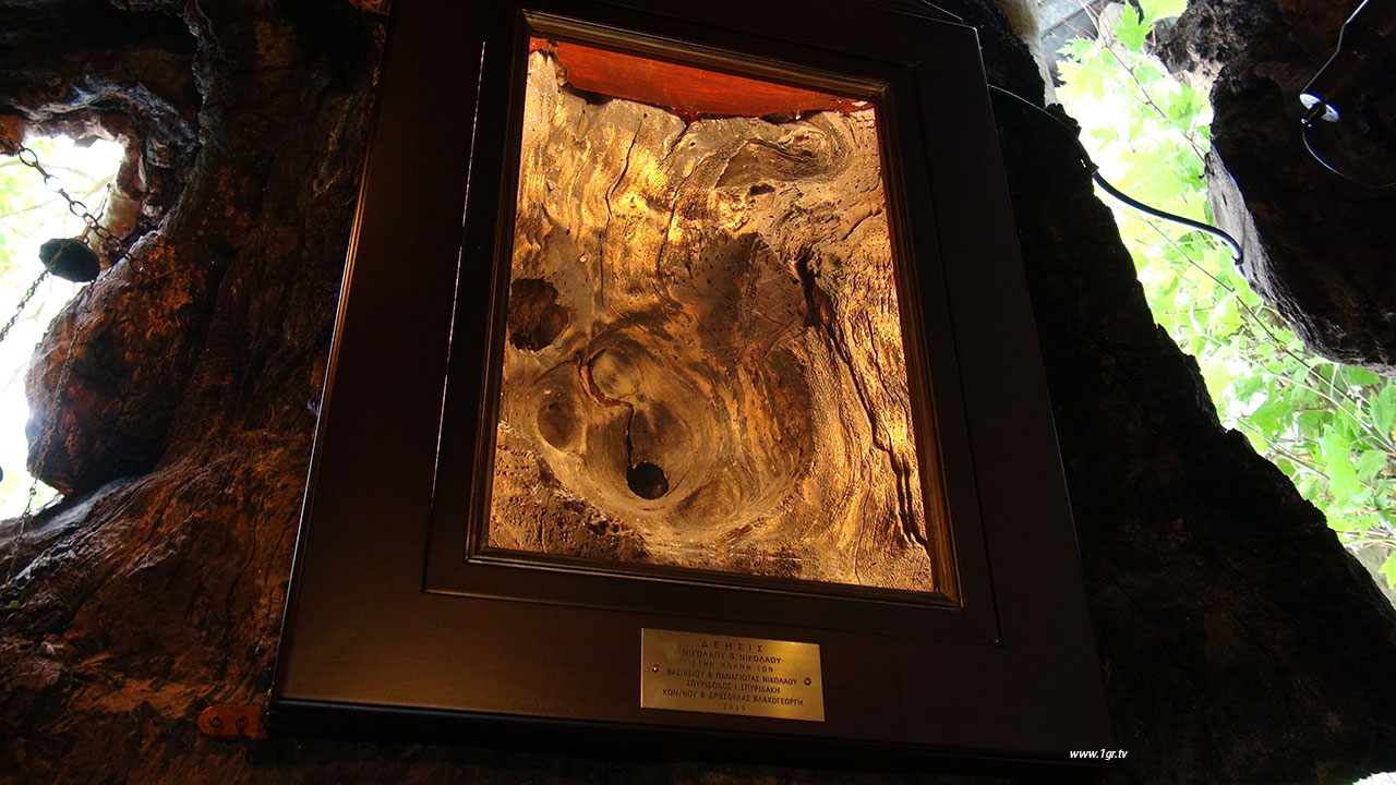 По преданию, в 840 году, в период иконоборчества, когда был сожжен монастырь Мега Спилеон, верующим удалось сохранить икону Богородицы, передавая ее из деревни в деревню. Однажды, путешествуя с ликом, монахи остановились на ночевку в этом месте, икону повесили внутри ствола платана. Утром, взяв образ, они обнаружили на дереве залитый светом его точный отпечаток.