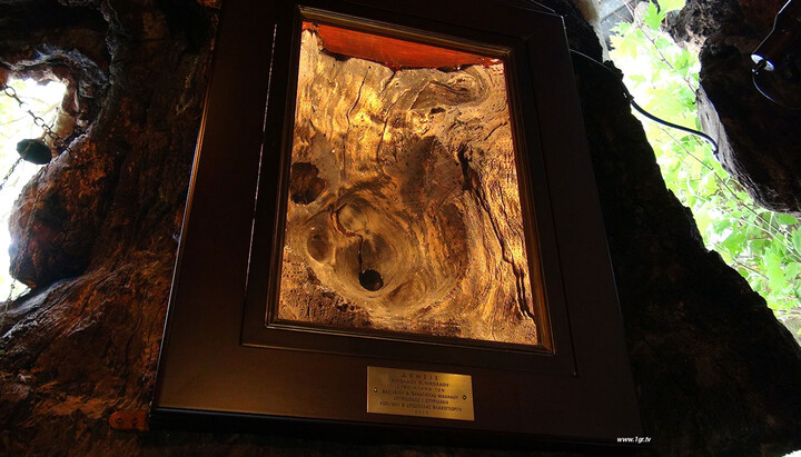 В естественной полости дерева хранится уникальная икона – текстура волокон изображает Богородицу, которая держит на руках Богомладенца.