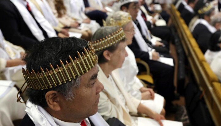 В американской Церкви поклонников оружия прошло массовое венчание, в ходе которого 300 супружеских пар с оружием и в коронах из патронов дали друг другу клятвы верности.