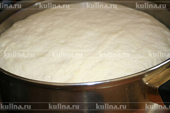 Подсыпать муку, вначале немного, взбить миксером, затем добавить остальную и замесить руками. Тесто должно быть легкое, воздушное, упругое и эластичное, хорошо отходить от рук.