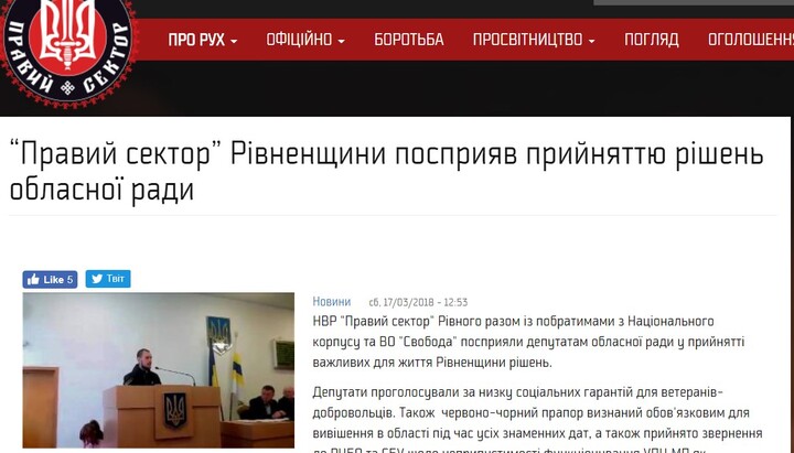 Одновременно с решением Ровенского облсовета, сайт «Правого сектора» сообщил, что «вместе с собратьями из Национального корпуса и ВО «Свобода» помогли депутатам областного совета в принятии важных для жизни Ровенщины решений».
