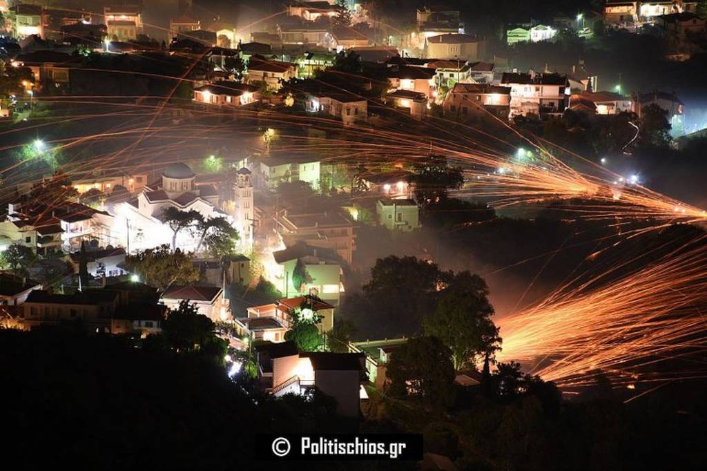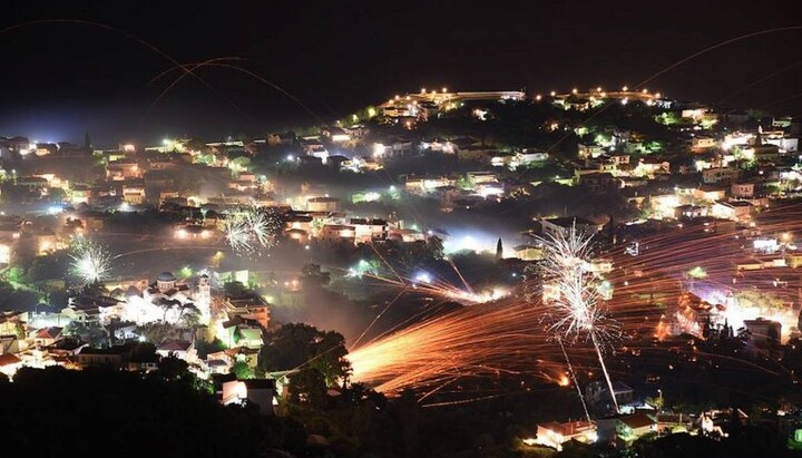Как сообщается, залпы фейерверков, произведенные в пространстве между церквями Агиу Марку и Панагии Эрифиани превратили ночь в день.