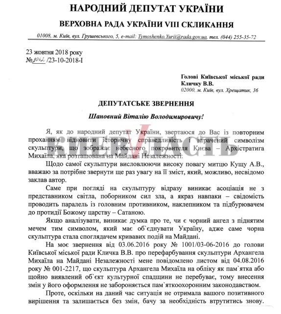 В своем обращении нардеп от «Народного фронта» Юрий Тимошенко пожаловался, что скульптура Архистратига Михаила, расположенная на Майдане Незалежности, вызывает страшные ассоциации. Об этом сообщает Киеввласть.