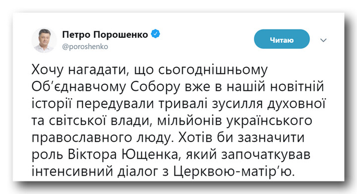 17:42 «Мы остановили агрессора!» – подытожил Порошенко, представляя Епифания. И присовокупил отчет об успехах на почве создания боеспособной армии, развития языка и т.п.