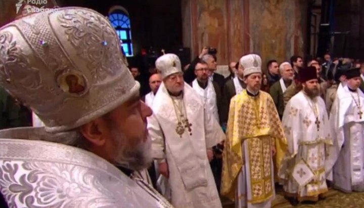 7 января на «архиерейской литургии» в Софии Киевской «Митрополиту Киевскому и всея Украины» Епифанию (Думенко) сослужили бывший иерарх УПЦ митрополит Симеон (Шостацкий) и экс-спикер УПЦ протоиерей Георгий Коваленко.