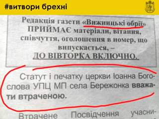 Издание опубликовало объявление, гласящее: «Устав и печать церкви Иоанна Богослова УПЦ МП села Бережонка считать потерянной».