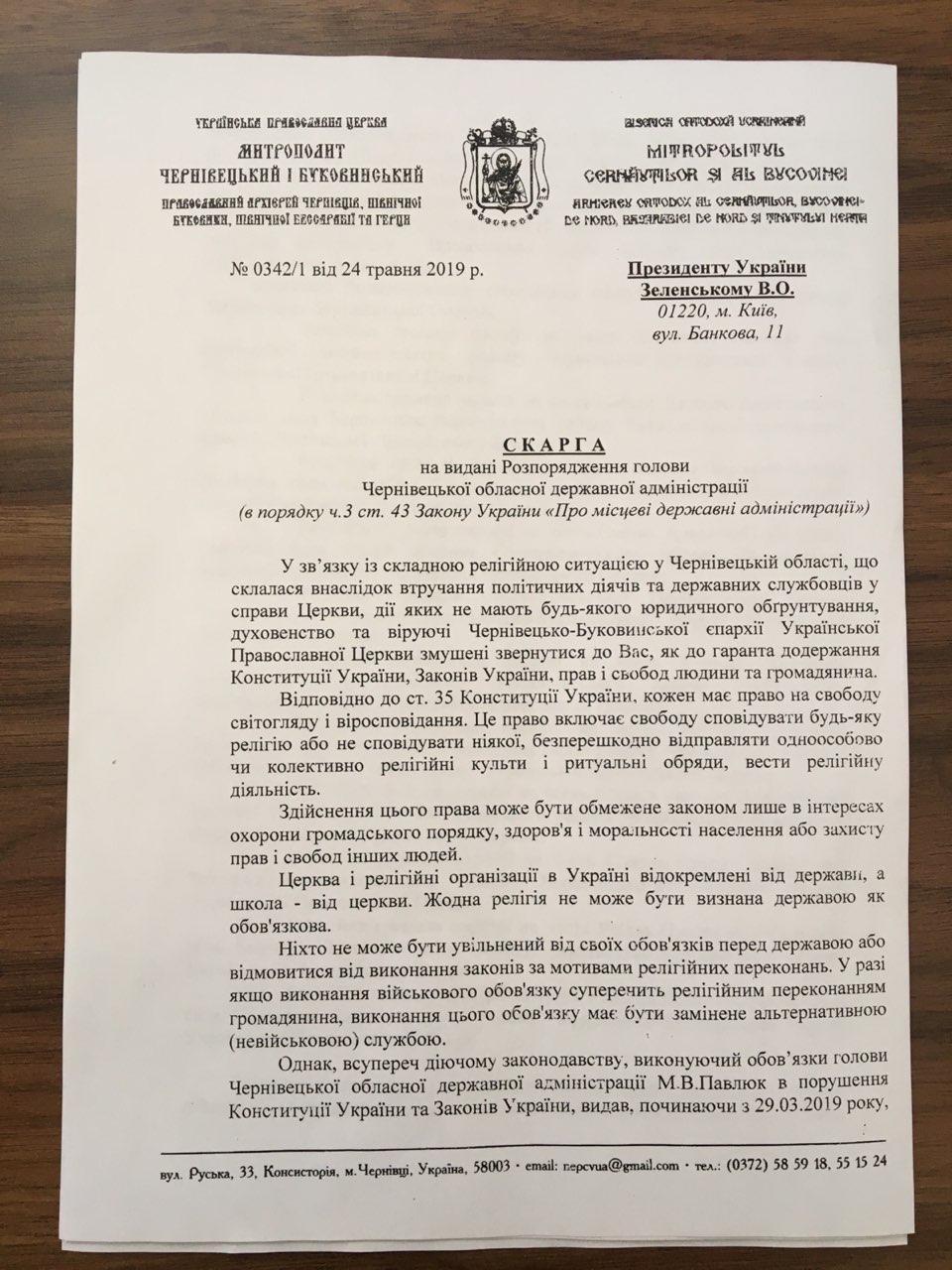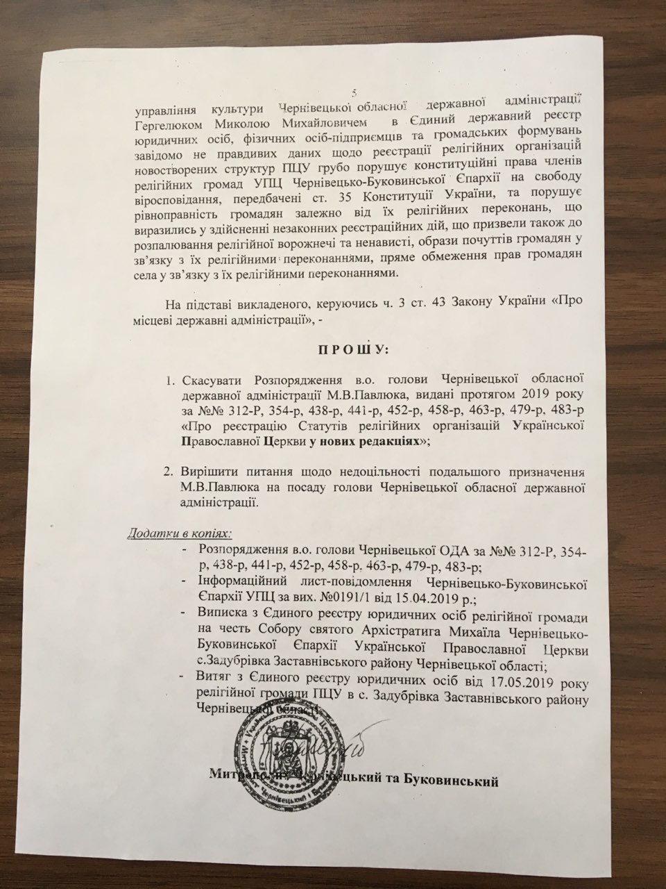 В связи с этим митрополит просит Президента отменить решения главы Черновицкой ОГА «О регистрации Уставов религиозных организаций Украинской Православной Церкви в новых редакциях», а также рассмотреть вопрос нецелесообразности дальнейшего пребывания Павлюка М. В. главой Черновицкой ОГА.