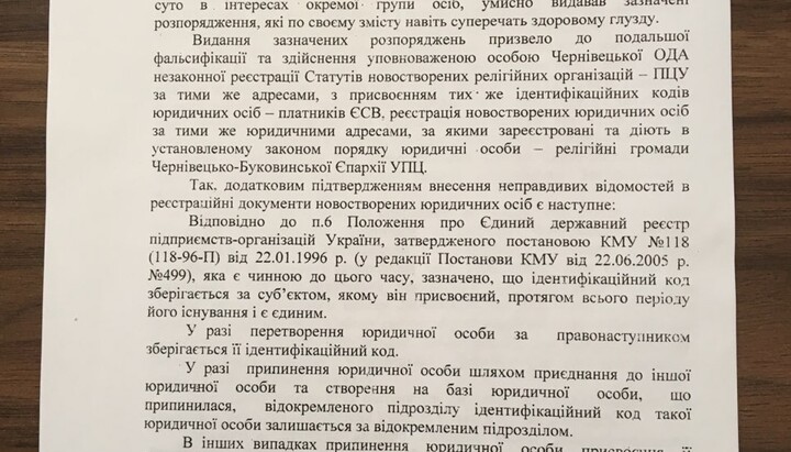 Владыка подчеркивает, что чиновник умышленно пренебрегает требованиями Закона и моральными основами добропорядочности, что приводит к дальнейшим фальсификациям и регистрации уставов новосозданных общин ПЦУ по тем же адресам и с присвоением тех же идентификационных кодов юридических лиц, которыми уже, согласно действующему законодательству, обладают общины УПЦ.