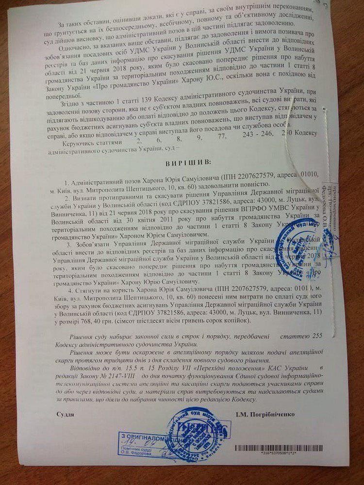 Суд обязал должностных лиц Управления ГМС в Волынской области внести в соответствующие реестры информацию об отмене решения о лишении гражданства Харона и возместить ему денежные затраты на судебный сбор.