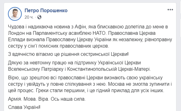 12 октября 2019 года бывший президент Украины Петр Порошенко поблагодарил в Facebook Элладскую Православную Церковь за признание ПЦУ.