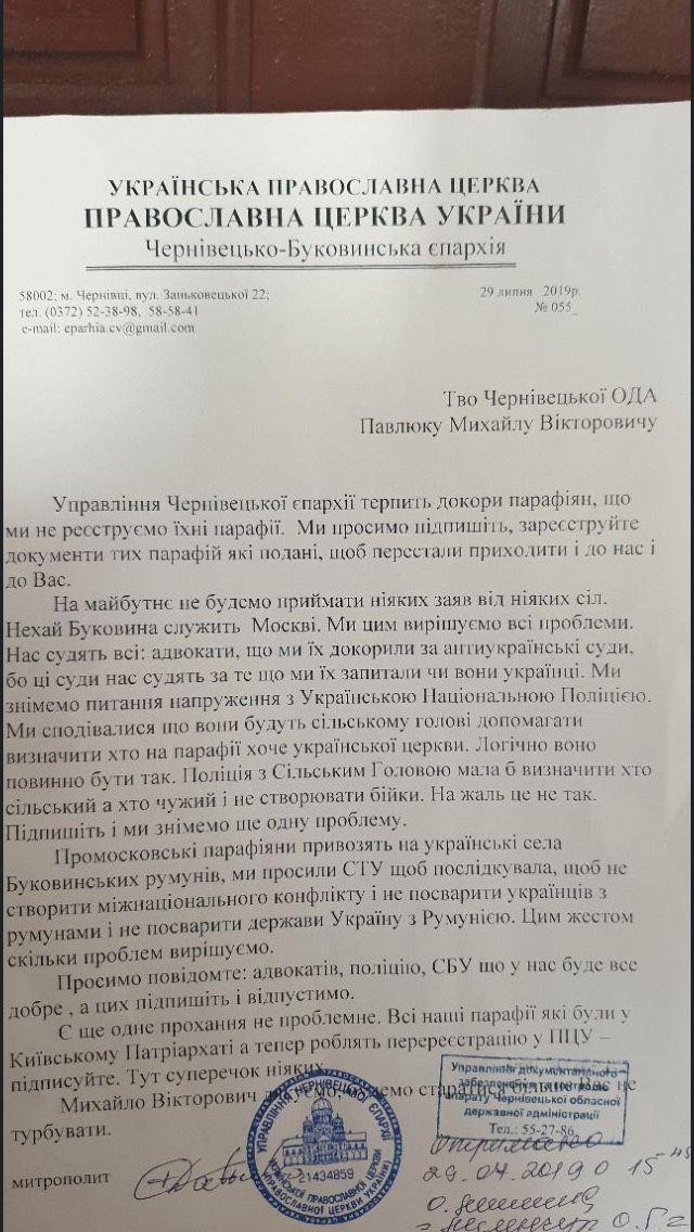 В распоряжение редакции СПЖ попало обращение «митрополита» Черновицкой епархии ПЦУ Даниила Ковальчука к и.о. главы Черновицкой областной государственной администрации Михаилу Павлюку от 29 июля 2019 года, в котором «иерарх» призвал чиновника зарегистрировать уже поданные документы приходов, изъявивших желание присоединиться к ПЦУ.