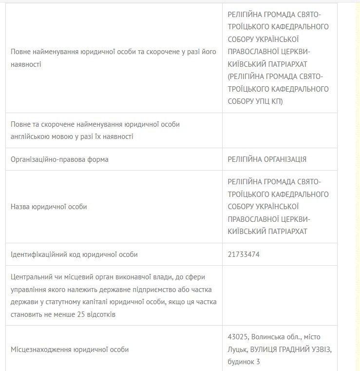 По состоянию на 7 июня 2020 года главный храм Волынской епархии ПЦУ – Свято-Троицкий кафедральный собор г. Луцка – не сменил свою регистрацию: его община остается в юрисдикции Киевского патриархата. Об этом свидетельствуют данные запроса в реестр юридических лиц Министерства юстиции Украины, сообщает корреспондент СПЖ.