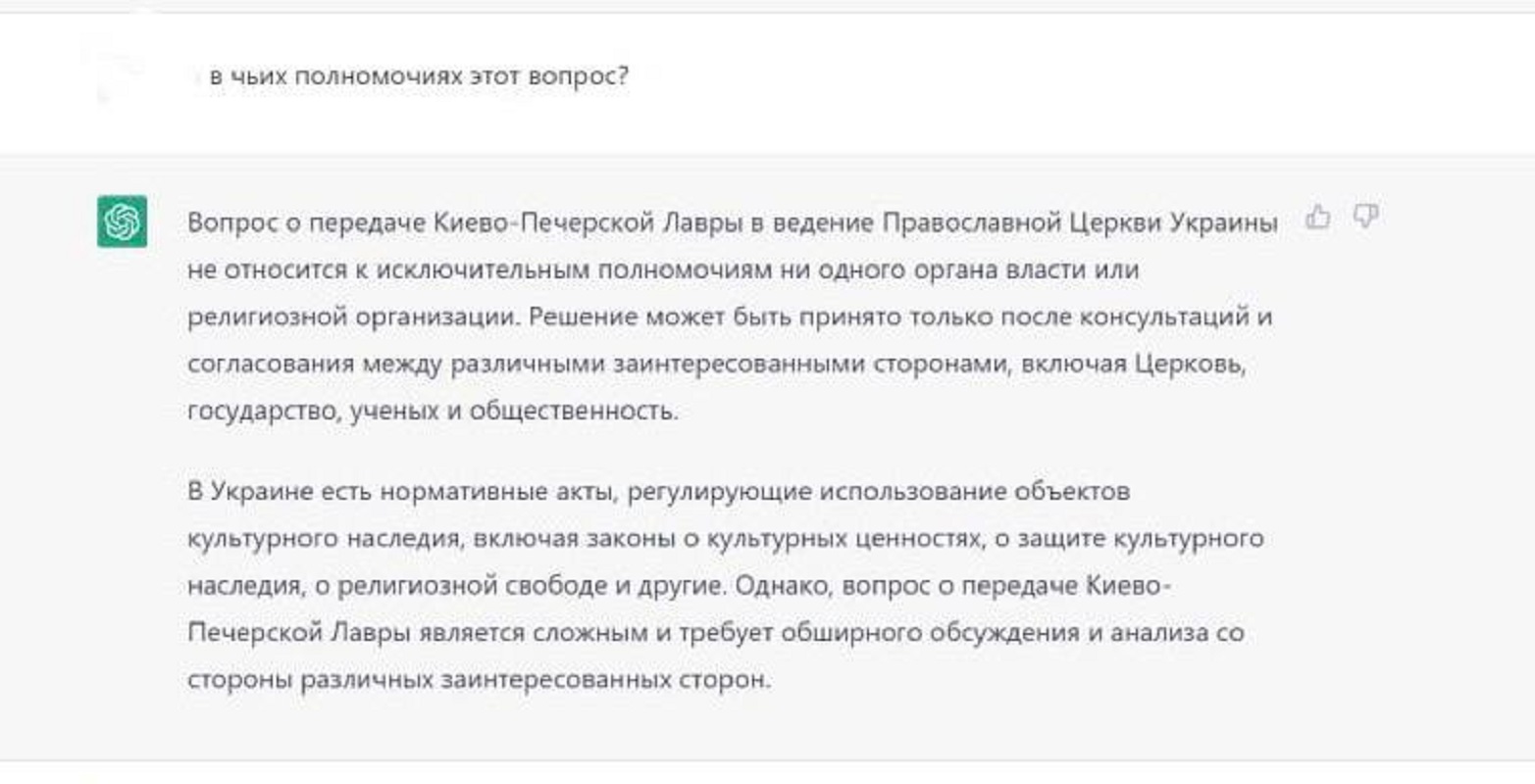 ChatGPT отметил, что «вопрос о передаче Киево-Печерской лавры в ведение ПЦУ не относится к исключительным полномочиям ни одного органа власти или религиозной организации».
