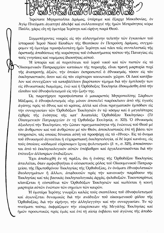 Во время Балканских войн национализм нанес удар Константинопольской Церкви, отметил Константинопольский патриарх Варфоломей в письме митрополиту Драмскому Павлу (Апостолидису), фотокопию которого опубликовало интернет-издание Оrthodoxia.info.