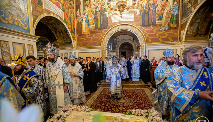 Предстоятелю сослужили наместник монастыря митрополит Вышгородский и Чернобыльский Павел, управляющий делами УПЦ митрополит Бориспольский и Броварской Антоний, епископы Барышевский Виктор, Белогородский Сильвестр, Вишневский Спиридон, Ирпенский Лавр, Бородянский Марк и духовенство обители.