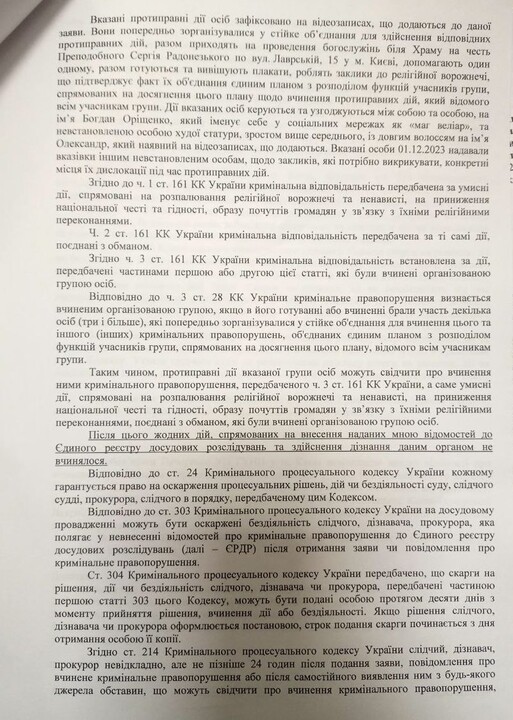 Также СПЖ писал, что по состоянию на 27 ноября 2023 г. Печерское райуправление полиции проигнорировало все 16 заявлений адвокатов Лавры о правонарушениях провокаторов возле монастыря. Суд обязал полицейских открыть 10 уголовных производств, однако они открыли только два.