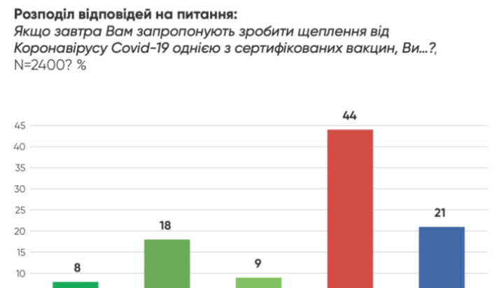 С 27 января по 5 февраля 2021 года Украинским институтом будущего (UIF) было проведено социологическое исследование, согласно которому 44% украинцев готовы не раздумывая отказаться от вакцинации от COVID, даже если завтра им предложат сделать прививку одной из сертифицированных вакцин, сообщает «Интерфакс-Украина».