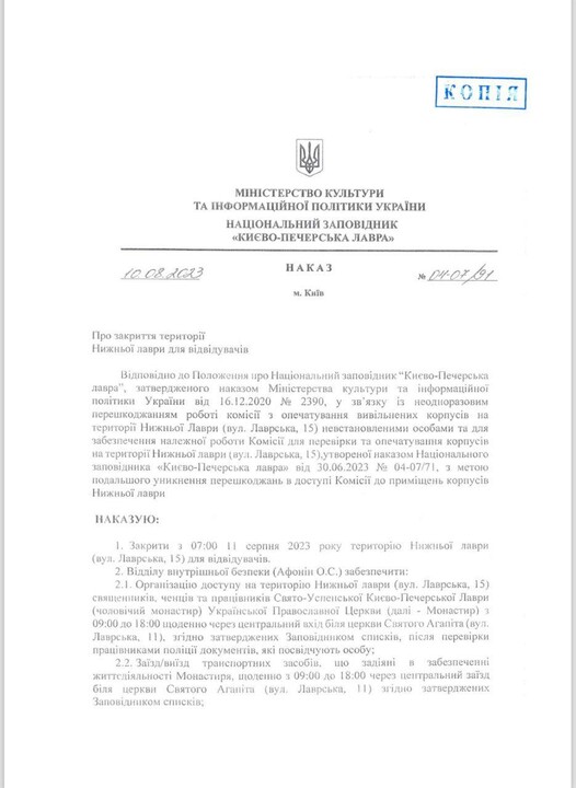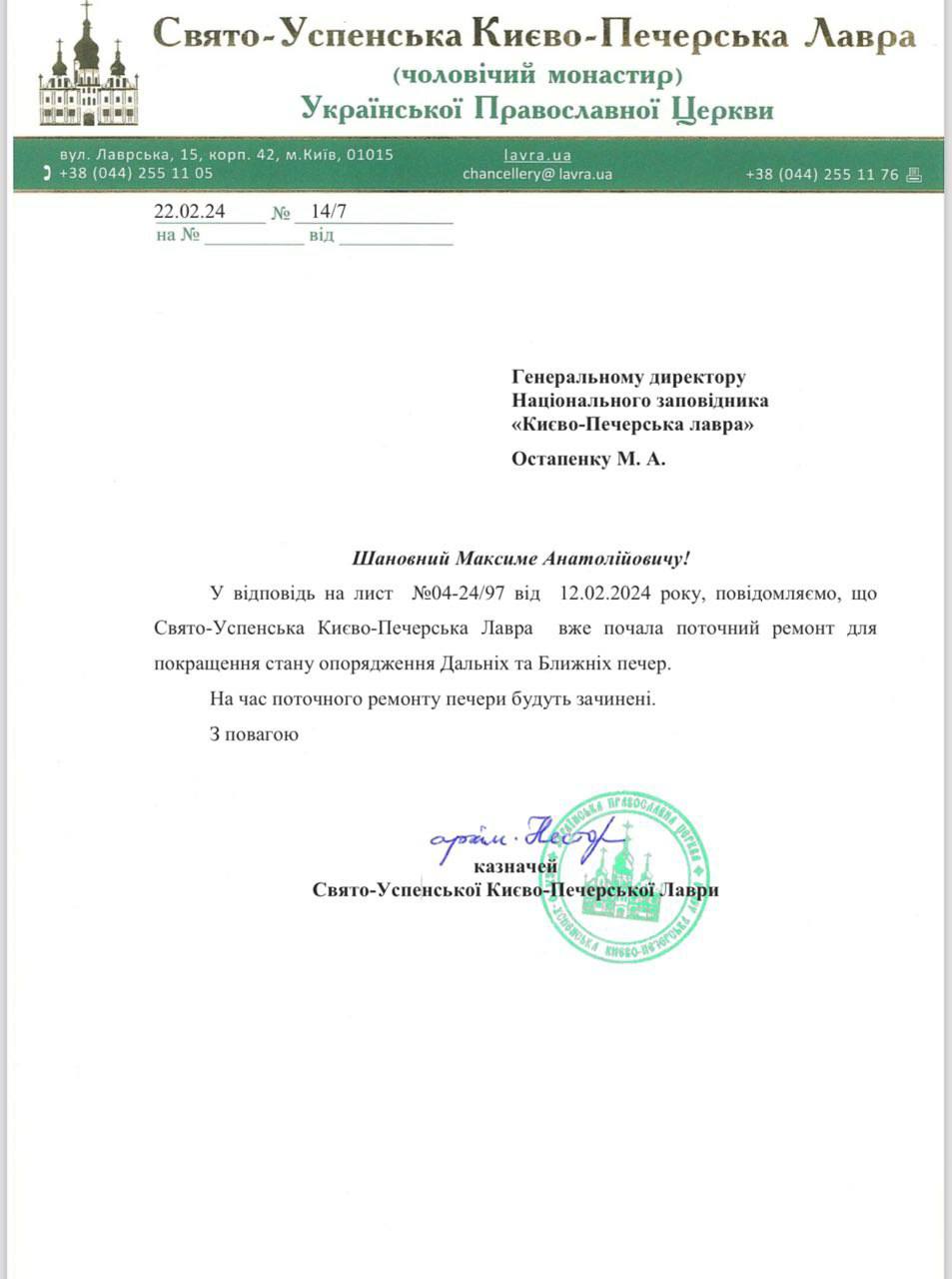 Глава заповедника «Киево-Печерская лавра» Максим Остапенко в письме в адрес монастыря заявил, что с 27 февраля начнет работу комиссия по «возвращению культурных ценностей с целью взятия их на учет», которые «фактически находятся в Ближних пещерах». Об этом сообщил в своем телеграм-канале адвокат Лавры протоиерей Никита Чекман.