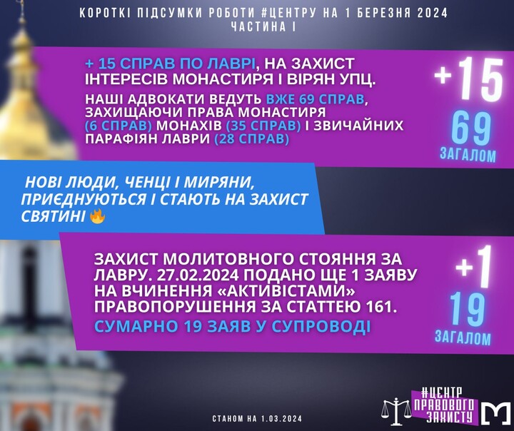 За два месяца роботы Центр правовой защиты УПЦ оказал поддержку 80 приходам, в судах ведут 10 дел православных общин и 69 – по Киево-Печерской лавре.