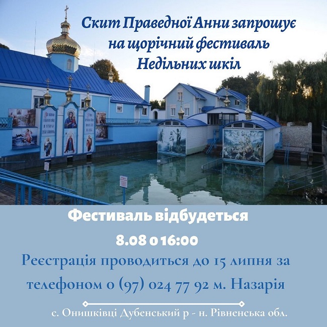 8 августа 2021 года при ските в честь святой праведной Анны Свято-Николаевского Городокского женского монастыря УПЦ в Онишковцах Дубенского района Ровенской области состоится всеукраинский фестиваль воскресных школ, сообщает на своей странице в Facebook Ровенская епархия.