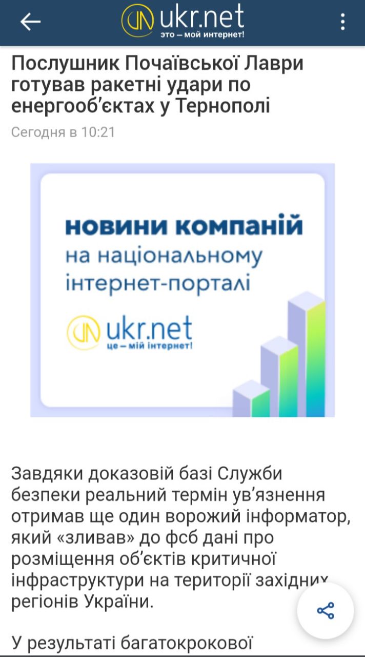 Отмечается, что в некоторых СМИ стали распространять сообщения с утверждениями, что некий осужденный на 15 лет за государственную измену 20-летний мужчина был послушником Почаевской лавры и проживал в селе Старый Тараж, Почаевской ОТГ.