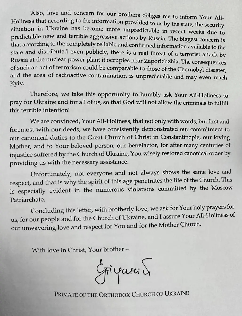 Ваше Всесвятейшество, Архиепископ Константинополя – Нового Рима, Вселенский Патриарх, во Христе Боге, очень дорогой и достойный брат и сослужитель нашего смирения, к.к. ВАРФОЛОМЕЙ, обнимаем Ваше Всесвятейшество в Господе и искренне и радостно приветствуем Ваше Всесвятейшество. Получив от Вашего Всесвятейшества письмо № 422 от 27 июня 2023 года, мы от своего имени и от имени Православной Церкви Украины подтверждаем нашу непоколебимую любовь и уважение к Вам, возлюбленному во Христе, достойному Патриарху нашей Матери-Церкви. От Вашего Всесвятейшества мы всегда получали и надеемся впредь получать помощь и поддержку в словах, решениях и действиях, через которые проявляется отеческая любовь Вашего Всесвятейшества. Я хотел бы воспользоваться возможностью, чтобы сердечно поблагодарить Ваше Всесвятейшество за теплый и радушный прием нашего представителя, Его Высокопреосвященства Митрополита Евстратия, который недавно нанес визит и имел плодотворное общение с Вашим Всесвятейшеством от нашего имени, о чем нам было подробно сообщено. Мы заверяем Ваше Всесвятейшество, что все, что было передано Вам на этой встрече в письменной форме и в разговоре, соответствует действительности. Мы также были проинформированы о плодотворной встрече, которую Ваше Всесвятейшество провело одновременно с уполномоченными представителями украинского государства. Мы высоко ценим желание, выраженное сейчас Вашим Всесвятейшеством в Вашем письме, поддержать нас и Православную Церковь Украины в трудных условиях войны, в которых мы живем, направив официальную делегацию в Украину от Вашего имени. До сегодняшнего дня мы не получили никакой информации от членов делегации, кроме той, что содержится в письме от Вашего Всесвятейшества. В частности, нам не сообщили о планируемом времени визита и ожидаемой программе визита, чтобы мы могли лучше подготовиться, обсудив детали с членами делегации. Это особенно важно, учитывая большое количество приглашений, которые наше смирение получило от епархий Православной Церкви Украины с просьбами посетить их, и которые уже заблаговременно запланированы. Вдобавок ко всему, любовь и забота о наших братьях обязывают меня сообщить Вашему Всесвятейшеству, что, согласно предоставленной нам государством информации, ситуация с безопасностью в Украине стала более непредсказуемой в последние недели из-за предсказуемых новых и ужасных агрессивных действий России. Наибольшую обеспокоенность вызывает то, что, согласно абсолютно достоверной и подтвержденной информации, которой располагает государство, и которая даже стала публично доступной, существует реальная угроза террористического акта со стороны России на оккупированной ею атомной электростанции вблизи Запорожья. Последствия такого террористического акта могут быть сопоставимы с последствиями Чернобыльской катастрофы, а зона радиоактивного заражения непрогнозируемая и может даже достичь Киева. Поэтому мы пользуемся случаем, чтобы смиренно попросить Ваше Всесвятейшество молиться за Украину и за всех нас, чтобы Бог не позволил преступникам исполнить этот ужасный замысел! Мы убеждены, Ваше Всесвятейшество, что не только словами, но прежде всего делами мы неизменно демонстрировали свою приверженность каноническим обязанностям перед Великой Церковью Христовой