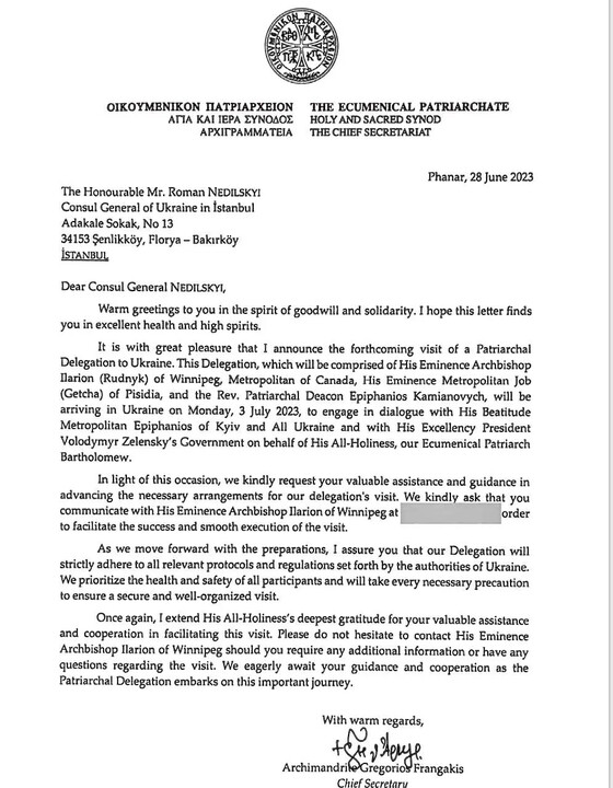 Дорогой Генеральный консул Недильский! Сердечно приветствуем Вас в духе доброй воли и солидарности. Надеюсь, что это письмо застанет вас в прекрасном здравии и хорошем расположении духа. С большой радостью сообщаю о предстоящем визите Патриаршей делегации в Украину. Эта делегация, в состав которой войдут Его Высокопреосвященство архиепископ Виннипегский Иларион (Рудник), митрополит Канадский, Его Высокопреосвященство митрополит Писидийский Иов (Гетча) и преп. Патриарший диакон Епифаний Камьянович, прибудет в Украину в понедельник, 3 июля 2023 года, чтобы вести диалог с Блаженнейшим митрополитом Киевским и всея Украины Епифанием и с правительством Его Превосходительства Президента Владимира Зеленского от имени Его Святейшества, нашего Вселенского Патриарха Варфоломея. В связи с этим событием просим Вас оказать ценную помощь и содействие в проведении необходимых мероприятий по организации визита нашей делегации. Просим Вас связаться с Его Высокопреосвященством архиепископом Виннипегским Иларионом, чтобы визит мог пройти успешно и гладко. По мере подготовки я заверяю Вас, что наша делегация будет строго придерживаться всех соответствующих протоколов и правил, установленных властями Украины. Мы придаем первостепенное значение здоровью и безопасности всех участников и примем все необходимые меры предосторожности для обеспечения безопасного и хорошо организованного визита. Еще раз выражаю глубочайшую благодарность от имени Его Всесвятейшества за Вашу ценную помощь и сотрудничество в организации этого визита. Пожалуйста, не стесняйтесь обращаться к Его Высокопреосвященству архиепископу Виннипегскому Илариону, если вам потребуется какая-либо дополнительная информация или возникнут вопросы относительно визита. Мы с нетерпением ждем Вашего руководства и сотрудничества, когда патриаршая делегация отправится в это важное путешествие. С теплыми пожеланиями, Архимандрит Григорий Франгакис, Главный секретарь Фанар, 28 июня 2023 года.