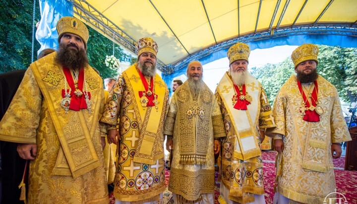 За богослужением троих архиепископов возвели в сан митрополитов, а четыре епископа стали архиепископами. Также Блаженнейший вручил иерархам УПЦ церковные награды за заслуги перед Церковью и по случаю личных юбилеев.