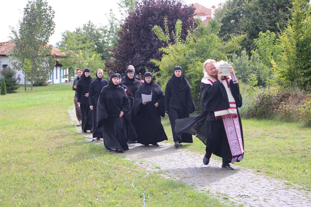 Владыка Иона в сопровождении ольшанских сестер под пение тропаря преподобному торжественно перенес ковчег в храм святого Онуфрия и установил в предназначенную нишу.