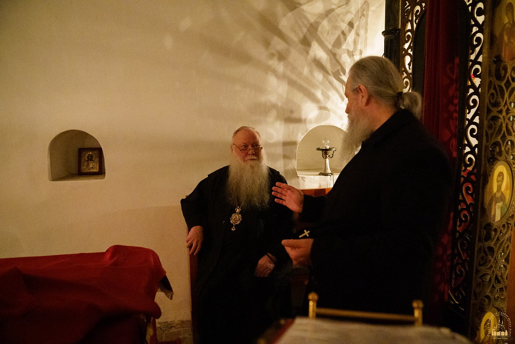 Специально для архиепископа Петра провели ознакомительную экскурсию по Лавре, начав с посещения Успенского собора. Митрополит Арсений рассказал о святынях Лавры, находящихся в Успенском соборе.