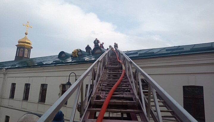 Видео тушения пожара на территории Киево-Печерской лавры опубликовал Telegram-канал «Київ Оперативний».