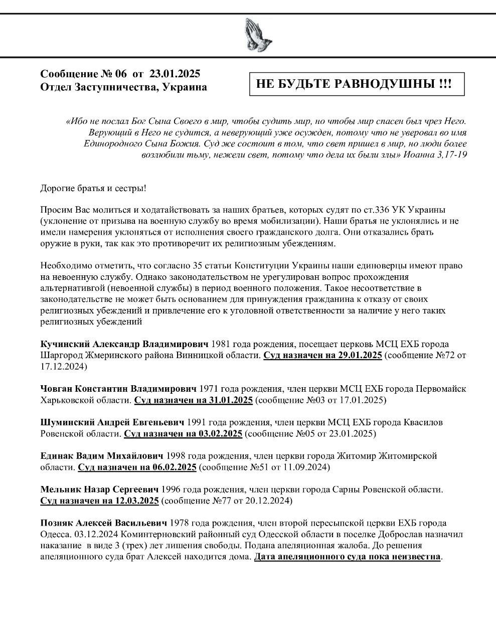 4. Единак Вадим Михайлович (1998 г.р., член церкви г. Житомира). Суд назначен на 06.02.2025.