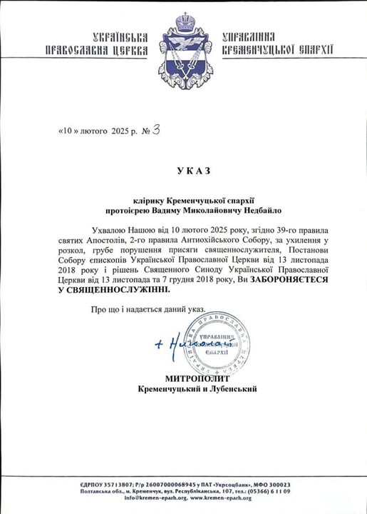 Отмечается, что иерей Георгий Александрович Крамаренко и протоиерей Вадим Николаевич Недбайло запрещены в служении «согласно 39-му правилу святых Апостолов, 2-му правилу Антиохийского Собора, за уклонение в раскол, грубое нарушение присяги священнослужителя, Постановлению Собора епископов Украинской Православной Церкви от 13 ноября 2018 года».