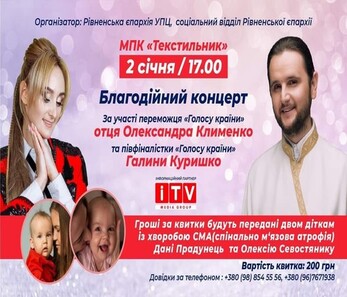 В Ровенской епархии Украинской Православной Церкви по благословению управляющего епископа Пимена состоится благотворительный концерт с участием победителя «Голоса страны» протоиерея Александра Клименко и финалиста конкурса Галины Куришко, сообщил на своей странице в Facebook отец Александр. Все вырученные средства пойдут на помощь двум малышам – Дане Прадунец из села Клевань и Алексею Севостьянику из города Сарны, которые больны спинальной мышечной атрофией (СМА).