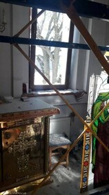 В храме выбиты окна и двери, осколками побило стены храма, а также повреждена церковная утварь.