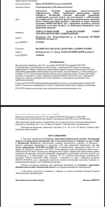 Завтра, 10 октября 2025 года, в 6 утра планируется силовое выселение прихода Успенского кафедрального собора Владимир-Волынской епархии УПЦ во Владимире. Об этом сообщали адвокат общины протоиерей Никита Чекман у себя в Телеграм-канале.